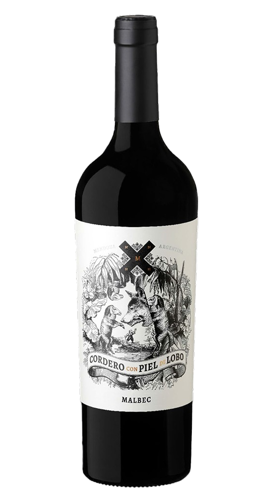 El Cordero con Piel de Lobo Malbec proviene de la bodega Mosquita Muerta en Mendoza, elaborado con uvas 100% Malbec procedentes de viñedos de altura. Su color es púrpura intenso, y en nariz ofrece una rica combinación de frutos oscuros como moras y ciruelas, junto con un toque especiado de pimienta y flores violáceas.