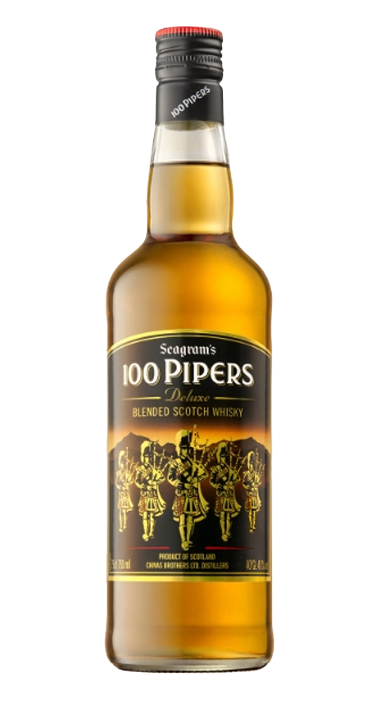 100 Pipers es un whisky Blended Scotch que proviene de Escocia y representa una mezcla de entre 25 y 30 whiskies de maltas y granos, muchos de ellos provenientes de la destilería Allt-a-Bhainne. Su nombre evoca la tradición antigua de “los cien gaiteros”, inspirada en la balada escocesa que habla de gaiteros conduciendo tropas.
